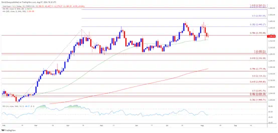 - 但跌势若不足以令价格收于50日均线(2369美元)以下可能会抑制金价近期的疲软,如果金价突破2450美元(38.2%斐波那契延伸位),则将冲击月内高点(2478美元)。